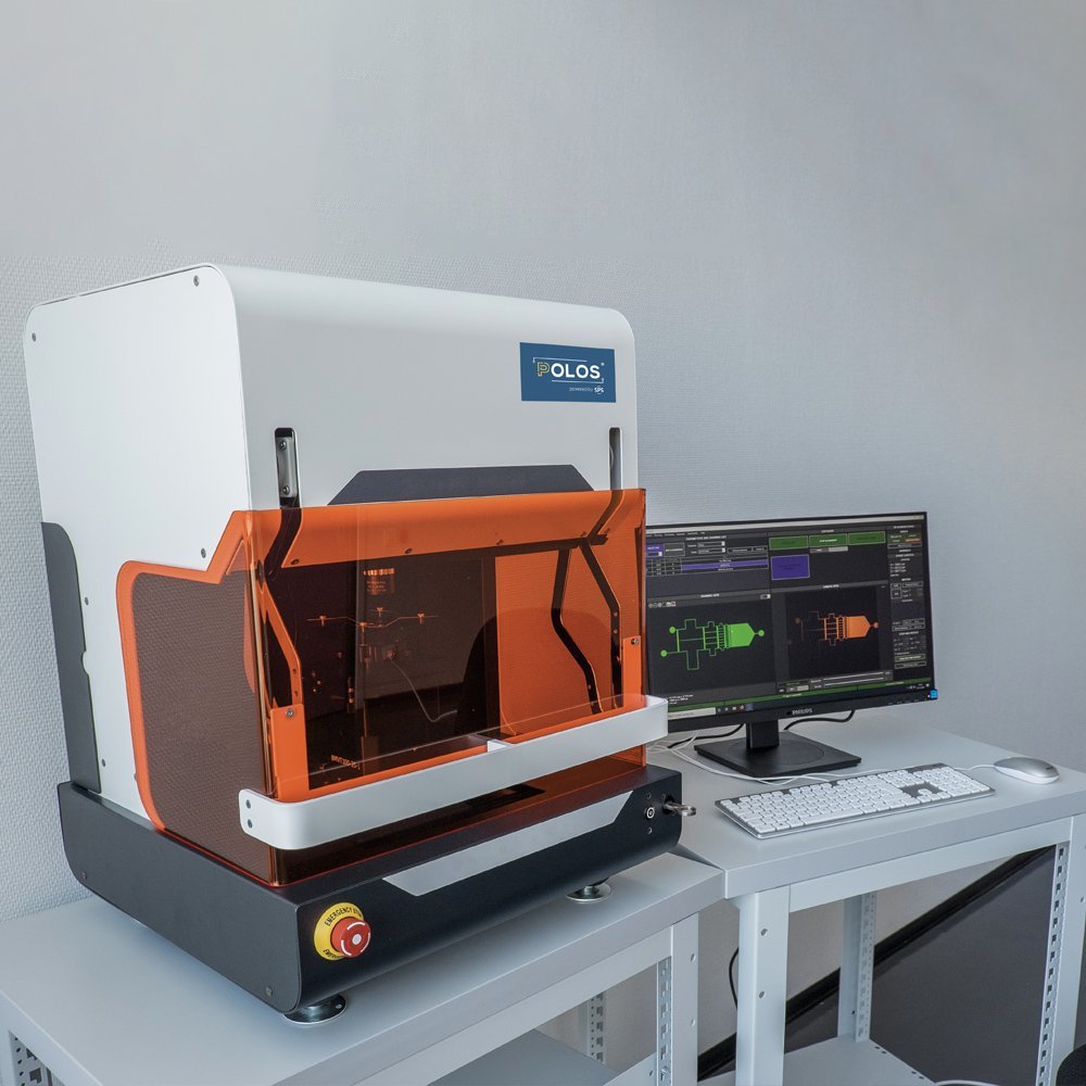 The POLOS® Print UV Standard is a maskless lithography equipment, based on a Digital Micromirror Device projection technology (DMD), compatible with a wide range of resists and substrates. This system can produce any 2D shapes at micron resolution without the need for a hard-mask.